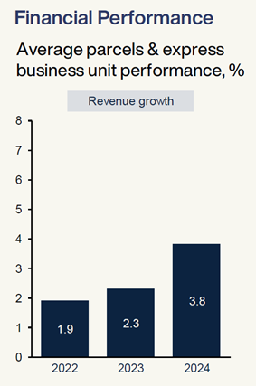 After declining by 3.7% in 2022, parcel volumes increased 5.7% in 2023 and continued to grow by 4.4% in 2024. Parcels & express revenue continued to grow, on average, by 3.8% in 2024, up from 2.3% in 2023.