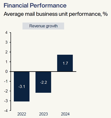 Since 2019, mail volumes have consistently fallen year-on-year due to evolving consumer habits and accelerated business adoption of digital channels. Although the rate of decline varied, the overall trajectory remained downward. Average mail revenue growth returned to positive territory at 1.7%, ending a two-year contraction period.