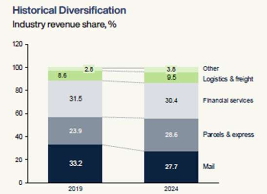 Over 65% of posts derived less than half of their revenue from mail services in 2024, up from 55% of posts in 2019. In 2024, postal operators accelerated diversification to counter mail decline and stabilise revenues. Parcels & express, financial services, and logistics & freight serve as primary revenue sources alongside mail.