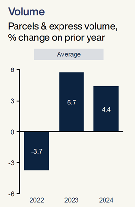After declining by 3.7% in 2022, parcel volumes increased 5.7% in 2023 and continued to grow by 4.4% in 2024. Parcels & express revenue continued to grow, on average, by 3.8% in 2024, up from 2.3% in 2023.