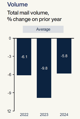 Since 2019, mail volumes have consistently fallen year-on-year due to evolving consumer habits and accelerated business adoption of digital channels. Although the rate of decline varied, the overall trajectory remained downward. Average mail revenue growth returned to positive territory at 1.7%, ending a two-year contraction period.
